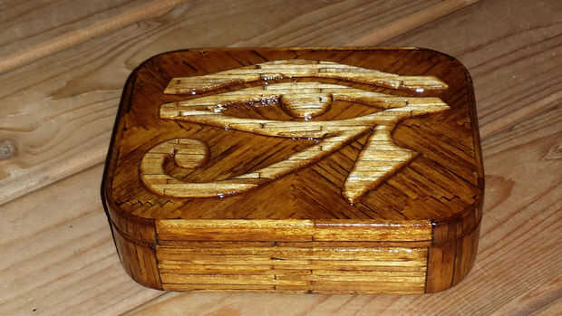 Siempre he estado fascinado por la mitología y religión egipcia antigua, y habiendo pasado por una gran cantidad de conflictos personales y no pequeña cantidad de problemas de salud en los últimos meses que he elegido un ojo de Horus como mi próximo diseño para alejar el mal y promover la buena salud, pensé que si era lo suficientemente bueno para faraones era lo suficientemente bueno para mí. Éste fue hecho deliberadamente para ver viejas y se utiliza como si podría haber ubicado en el bolsillo de Imhotep se que supervisó la construcción de la pirámide de Zoser, también un patrón triangular escalonado en el fondo de la parte superior y en la base como un guiño hacia la imagen de las pirámides.