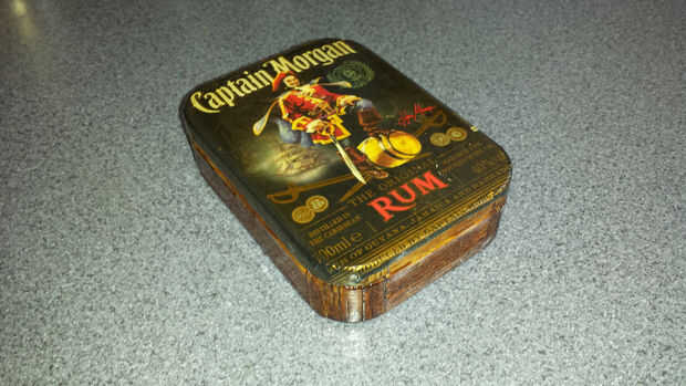 Robin y Kat me habían regalado una botella de Captain Morgan para mi cumpleaños y algo sobre la etiqueta sólo gritó a mí por lo que estaba empapado de la botella y secado bajo una prensa, pintada con una mezcla 50/50 de pintura, aguarrás, que hizo el papel de la arruga un poco como seca dándole un aspecto de viejo amo bastante satisfactorio como una pintura al óleo craquelado , estaba manchada la madera a un marrón profundo oscuro muy similar al color del ron, pude han vendido esta lata muchas veces pero me gusta bastante de él por lo que se alojará conmigo.