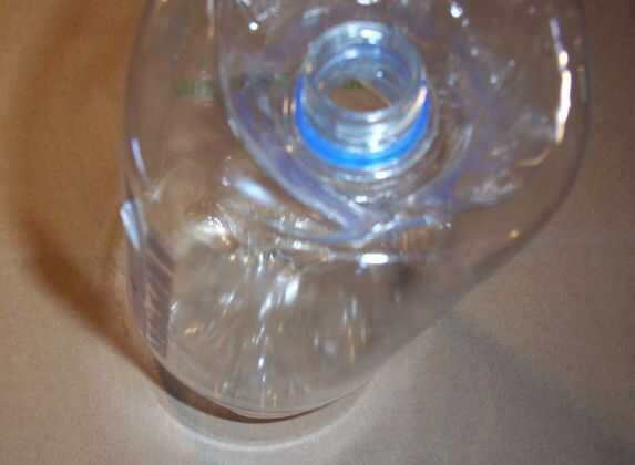 Aquí es la botella con la boca empujada hacia adentro. Me olvidé de sacar la tapa antes de empezar así que tuve que cortarlo cuidadosamente apagado después. Gran sorpresa! Es más fácil antes de ser empujado hacia adentro y rodeado de plástico caliente.