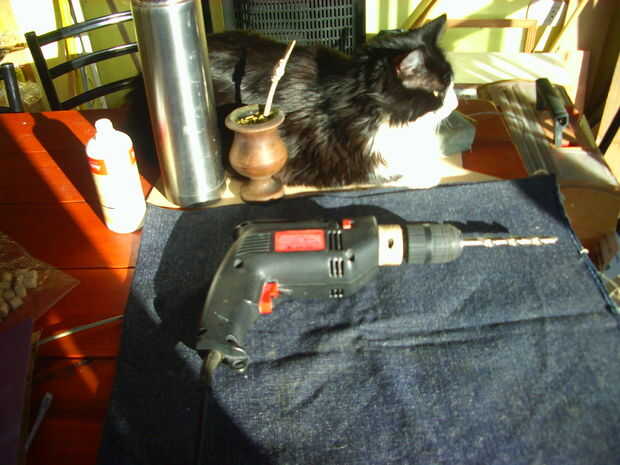 Hace unos días decidí reparar las cortinas correderas de sombra parcial que había destruido el perro de mi hijo . Cuando recogiéndolos, descubrí con alarma que la viga de madera de pino donde estaban colgando, estaba empezando a pudrirse. Cambio sería un trabajo muy difícil, porque como él apoya parte del peso de la cubierta, sería necesario que respalde esto durante el reemplazo. Además, como parte de la espalda de la casa, la estética no es importante. Así que decidí repararlo y durar un poco más. Hecha bajo la podrida termino un soporte de ángulo de hierro, soldado con autógena, que atornillado a la pared con tres tornillos robustos y tapones de Fischer. Luego postulé a la viga el siguiente tratamiento: