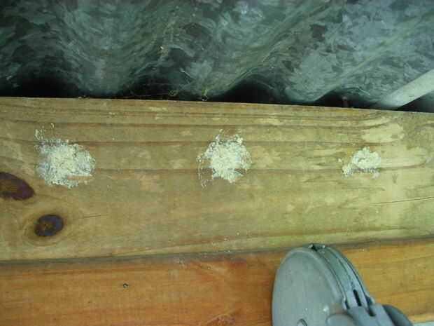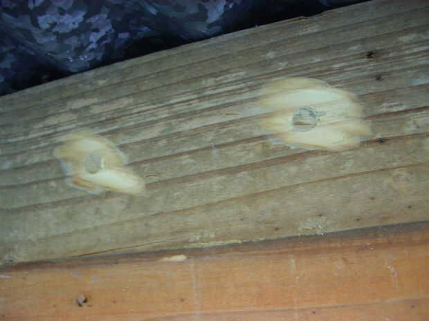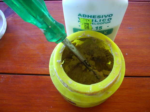 Entonces tomé el vinilo adhesivo y sellar los agujeros de 12 mm con las láminas de madera de 6 mm x 12 mm de paso 1, convirtiendo así cada agujero en un compartimiento hueco pequeño. Puesto que en muchos lugares no pude lograr un buen sello entre la tapa y el borde del agujero, hice una pasta de aserrín y pegamento, utilizado como masilla para cubrir pequeñas irregularidades. No por estética, pero para hacer los compartimientos huecos tan herméticas como sea posible. Yo deje que se seque la masilla alrededor de tres horas y luego lo destruyó con un disco de lija