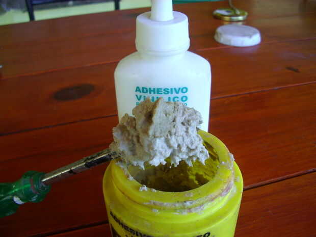 No dado en muchos lugares pude lograr una junta hermética entre los tapones y el borde del agujero, hice una pasta de Earte y adhesivo, usé como masilla para tapar las pequeñas irregularidades. No por estética, sino para hacer las cámaras huecas lo más herméticas posibles. Dejé secar la masilla unas tres horas y la emparejé con un disco lijador.