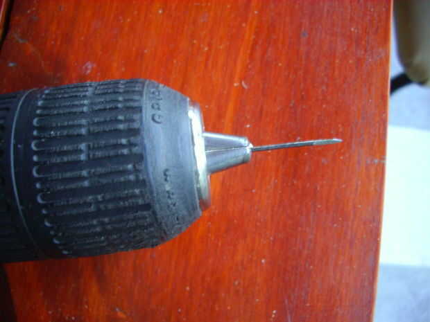 Entonces tomé un alambre de acero de 1 mm de espesor, que Sharp su punta con forma triangular para el uso como una broca. Puse en el taladro y que permanecen tan rectos como sea posible. Podría se utilizado una broca adquiridas para esto, pero estas son muy frágiles y no vale la pena el riesgo. Con este pedacito pequeño improvisado que perforar un agujero en la parte superior de cada rodajas de madera de 6 x 12 mm, que también resultó un poco difícil para el problema que representaba el alero del tejado, como he mencionado anteriormente.