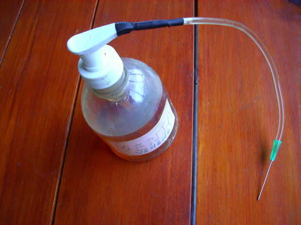 Tomé una antigua botella vacía de jabón líquido, que el mecanismo de bombeo para suministrar el líquido presionando la parte superior. He añadido un tubo de PVC flexible suave a la salida, ajustada con espaguetis de encogimiento para exterior y rígid paja dentro. En el extremo de la pajita flexible de PVC suave doble una aguja hipodérmica, que, por precaución, quité la punta afilada al molinillo. Yo lleno el recipiente de insecticida-fungicida especial para madera.