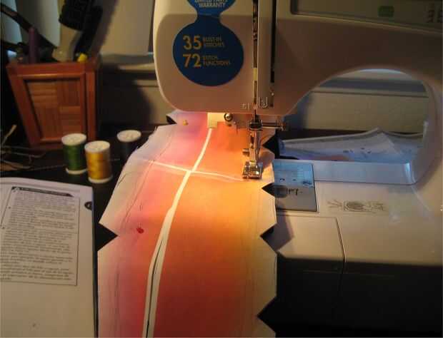 Cosí el derecho del patrón a la tela porque sólo parecía más fácil de esa manera. Además, si cambia a un tamaño más pequeño de la puntada como vas alrededor de curvas cerradas, la máquina va lenta y agradable y te da tiempo a manipular la tela alrededor de la curva.