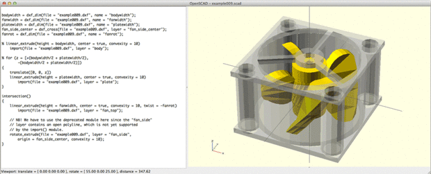 "OpenSCAD es un software para la creación de objetos de CAD 3D sólidos. [cortar] OpenSCAD no es un modelador interactivo. Es algo así como un 3D compilador que lee en un archivo de guión que describe el objeto y el modelo 3D de este archivo de secuencia de comandos. Este le da (el diseñador) completo control sobre el modelado de procesos y le permite fácilmente cambiar cualquier paso en el proceso de modelización o hacer diseños definidos por parámetros configurables.