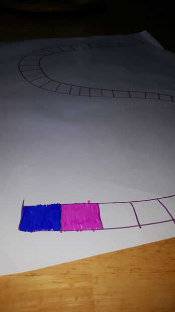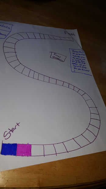 Colorear el tablero es fácil! Utilice los colores dos marcador elegiste y ponerlos en un patrón. En mi caso, fue blue-pink-blue-pink-blue-pink, etc.. Asegúrese de que pones las etiquetas donde el inicio y el final son, y pongo un recordatorio en el lado de la Junta, indicando: Si caes en 2 rosas en una fila... etc. Yo sólo color lo forma parte aquí, pero usted puede ir toda la longitud.