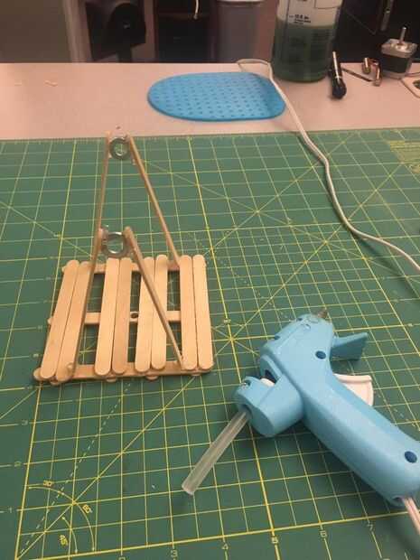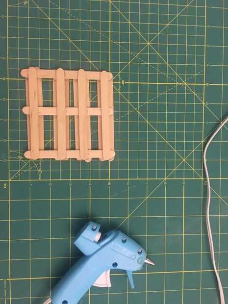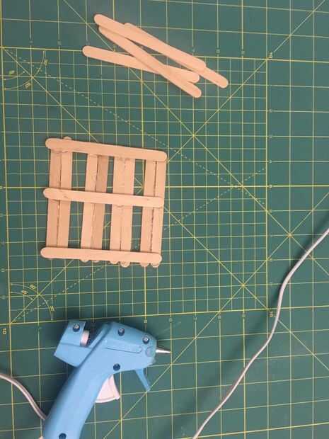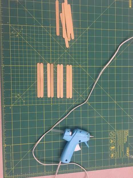 Pegamento caliente la paleta se pega junto en parejas de dos para 4 grupos de 2 (maaath). Poner tres palitos, uniformemente espaciados y verticales encima de los pares y pegar allí.