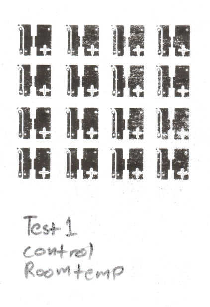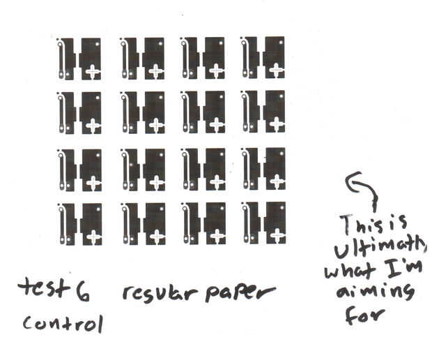 este verano estuve probando hacen que materiales imprimibles mejor hierro en toner transferencia (PCB), aquí están los resultados de impresión iniciales. Nunca conseguí cualquier parte porque cuando he intentado transferir prueba 6, deformado el infierno fuera de la Junta y el papel se negó a liberar, en definitiva, (utilicé una plancha modifiqué el interruptor térmico en). Pruebas 1-4 fueron enceradas en papel de cocina. Las pruebas de 5 y 6 eran en papel de la impresora "normal".