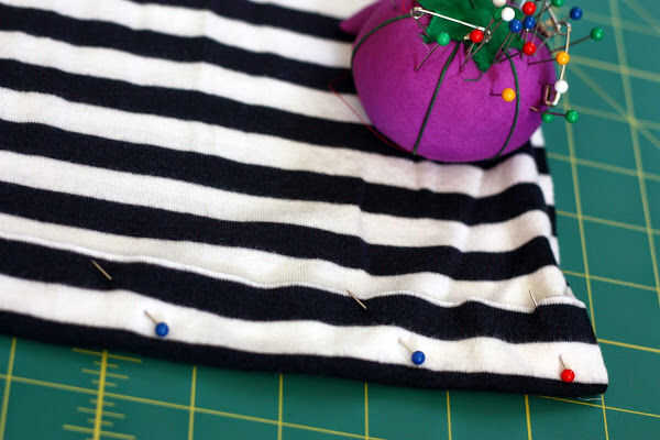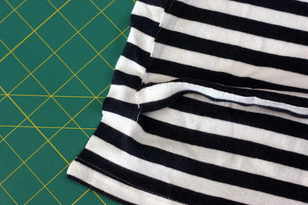 En la foto de abajo, se voltea la camiseta más ahora la parte delantera está boca arriba, todavía en el interior hacia fuera (es decir, un derecho lados juntos). Doblar la parte inferior del panel frontal dos veces creando un dobladillo y puntada recta en la parte inferior para que coincida con el punto existente en el dobladillo en la parte posterior.