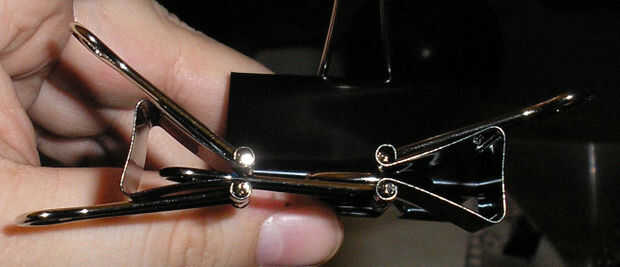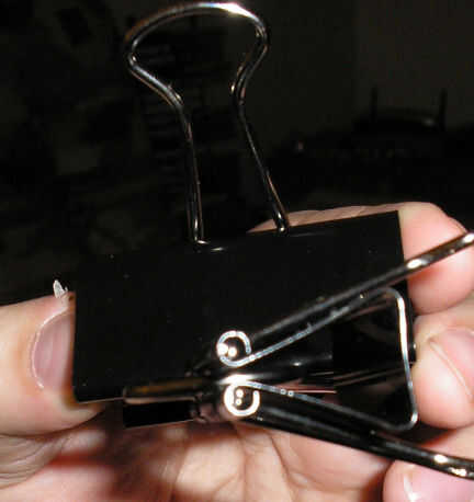 ello mediante el uso de la pinza grande a uno de los clips de media cuña abierta, como se muestra en la tercera imagen. nada puede tener alrededor de que usar como una cuña estará bien así, pero estaba hacia fuera conseguir el resultado final que se muestra en la figura 2 utilizando sólo binder clips.