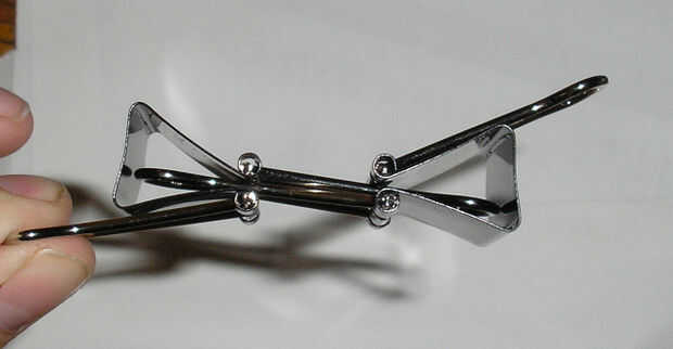 a continuación, clip el clip medio segundo a la pierna de la primera, como se muestra en la cuarta imagen. conseguir la pierna superior del clip mediano a la izquierda en el uno a la derecha alrededor girando sobre un eje mientras que todavía se recorta, deslizando la pierna en el clip a la derecha, y luego sacando el clip grande. el resultado final debería verse como imagen 2-dos clips de la carpeta Media en una especie de bolsa de pierna.