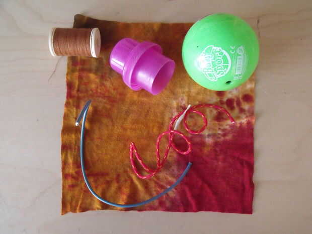 Pelota de goma pequeña 9 cm, parte superior de la botella de una botella de washdetergent, un pedazo de cuerda, un trozo de alambre de cobre, un pedazo de material de la camisa de T (Foto 3)