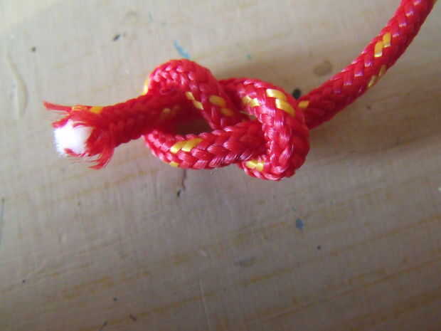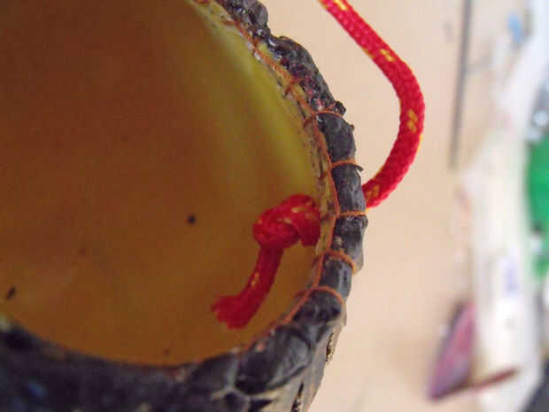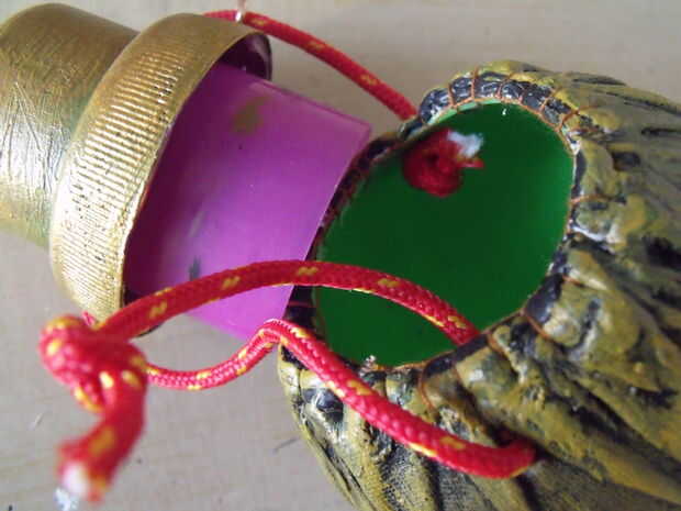 Hacer un nudo en un pedazo de cuerda. Pase a través del agujero en la pelota de adentro hacia afuera. Luego pasarlo a través de los lazos en el alambre de cobre de la PAC. En la pelota otra vez a través de un nudo dentro y el otro agujero.