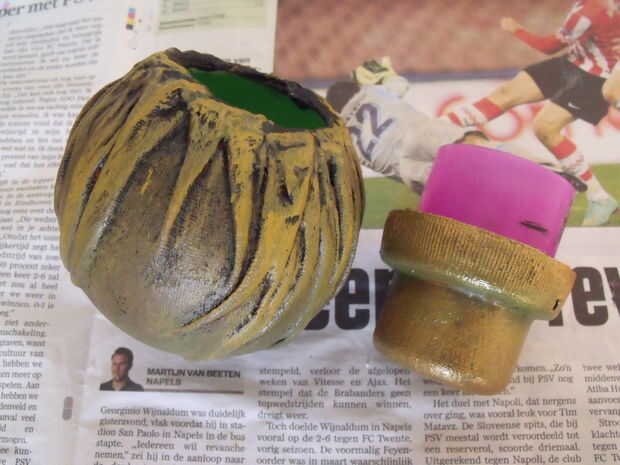 Acentuar los pliegues en la bola con amarillo ocre, y pase un pincel casi seco sobre la bola entera para asemejarse a la piel erosionada. Dar la tapa de una capa muy fina de pintura de oro o cobre a metal.