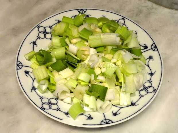 1 puerro mediano, lavado, limpiado, almohadilla seca, la parte verde y blanca utilizada, corta en aros