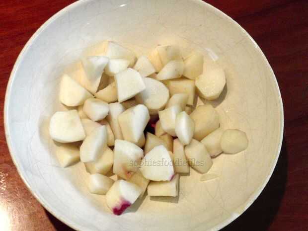 6 medianas cosecha nabos, (1 + 1/2 taza) limpiado, pelan y troceado en trozos de tamaño de un bocado (empujados en las copas cuando el pelado, limpiar y trocear)