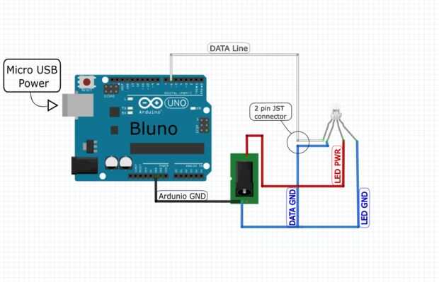 También tenga en cuenta si está usando el filamento LED figuran en la descripción, viene con un conector JST de 2 clavijas en las líneas de datos y de la tierra de LED al inicio y al final de la cadena. Desea conectar el lado femenino de la JST (el inicio de la cadena) al pin de datos 6. Conector JST macho es así usted puede encadenar varios hilos juntos. Si enchufarlo al revés, no pasará nada.