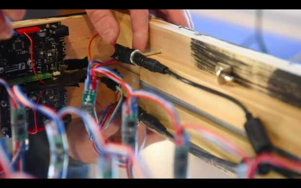 Si utiliza la cadena exacta de LED que estoy usando, el cableado será igual que el anterior. Sin embargo, usted debe comprobar el diagrama de cableado de su específica cadena de LED. También tenga en cuenta que el suelo de la línea de datos tiene que estar ligada a la tierra de la fuente de alimentación de 5v, que también está ligada a la tierra del Arduino como se muestra en el diagrama de cableado.