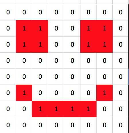 Hay algunas maneras de cómo almacenar este tipo de matriz en el código de Arduino.Así: byte image[] = { 0, 0, 0, 0, 1, 0, 0, 0, 0, 0, 0, 1, 1, 0, 0, 0, 0, 0, 0, 0, 1, 0, 0, 0, 0, 0, 0, 0, 1, 0, 0, 0, 0, 0, 0, 0, 1, 0, 0, 0, 0, 0, 0, 0, 1, 0, 0, 0, 0,