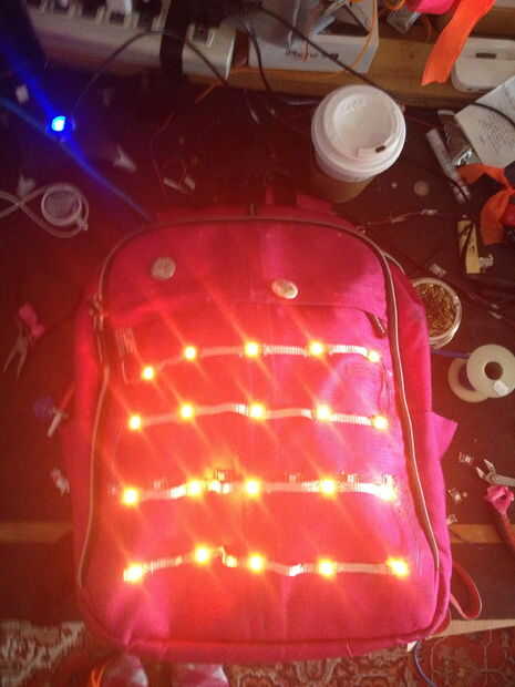 Ponga su proyecto en el lugar en tu mochila y coser a través de la cinta de nylon en muchos lugares cuando sienta que son necesarios para mantener los LEDs en su lugar. Simplemente cosí unos pequeños puntos alrededor de cada pocos LEDs. También pasé algún tiempo extra el Arduino en lugar de coser. (Por suerte, el Arduino tiene agujeros en él, que lo hacen fácil de coser en su lugar, así!)