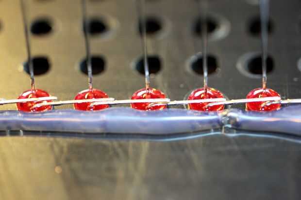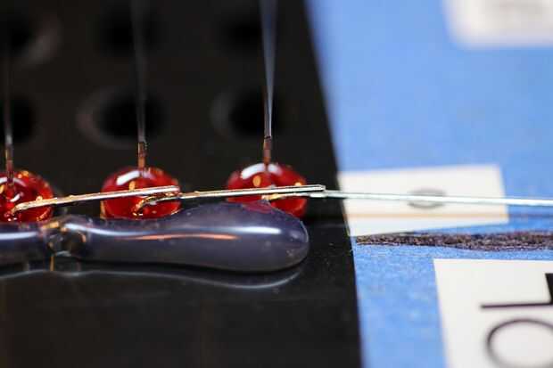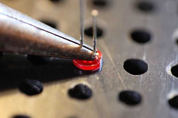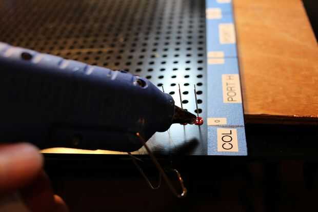 Después de cada curso, utilizo una pistola de pegamento caliente para asegurarse de que los LEDs no vienen sueltos de la hoja de plástico. No tiene un montón de pegamento – sólo una fila a un lado del LED. Tratar de mantener el pegamento de los cables ya que esto hace más difícil (y hace más humos) durante la soldadura. Existen alternativas al uso de una pistola de pegamento caliente como modelo plástico cemento o epoxi.