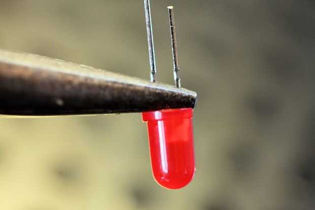 A continuación doblar el cátodo las piernas 90 grados hacia la derecha con el dedo. Deben ser planas y encima el plomo del cátodo a la derecha. No corte el cable de la derecha. Los otros se pueden cortar como se muestra abajo para soldar. Los conductores pueden ser ya sea encima o al lado del contigua plomo de cátodo. Doblándolas hasta que toquen hacen soldar ellos mucho más fácil. Salir de la situación de ánodo (pata más larga) por ahora.