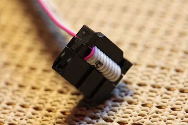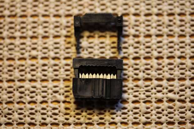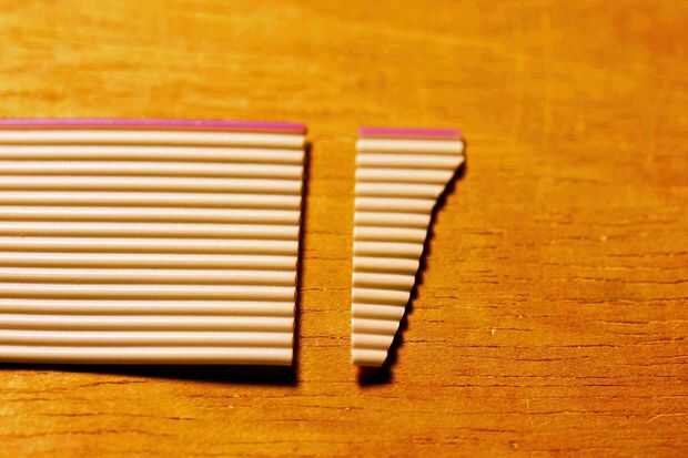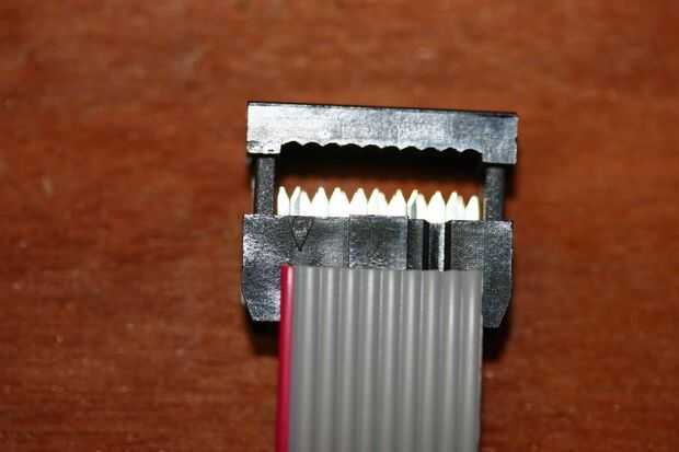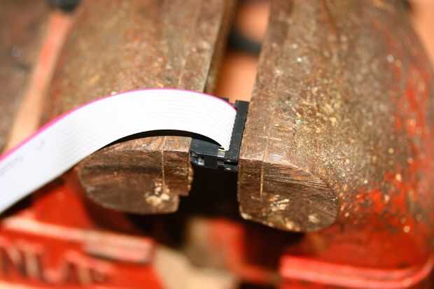 Usando las tijeras, asegúrese de que tener una 90 grados corte en cada extremo. Inserte un extremo del cable de cinta en el conector del juego la flecha del conector con el conductor de índice. Debe quedar al ras o extender un poco en el otro lado. Asegúrese de insertarlo directamente. Pellizque el cable con los dedos para mantener el extremo del cable. A continuación, inserte el conector en una mordaza o alicates para prensar el conector al cable. Me gusta un vicio porque es fácil de aplicar incluso la presión. Debe oír uno o dos clics como los seguros del conector al cable. A veces escucho a 1, a veces no, generalmente 2. No sobre apriete el conector.