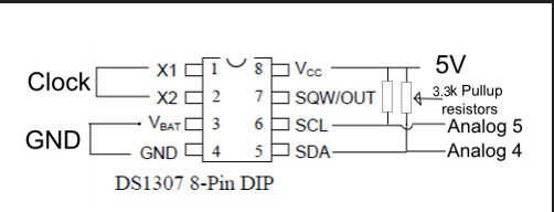 DS1307 está fácilmente disponible casi por todas partes. es un chip RTC popular que requiere pocos cables. conectar patillas SDA a A4 y SCL al A5 pin de arduino