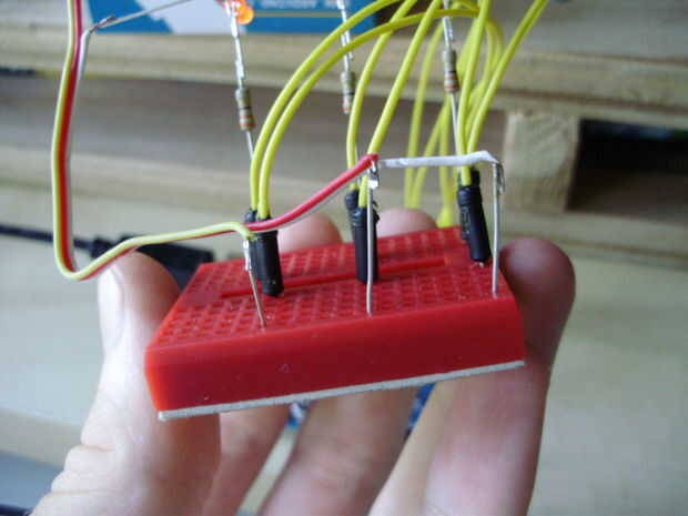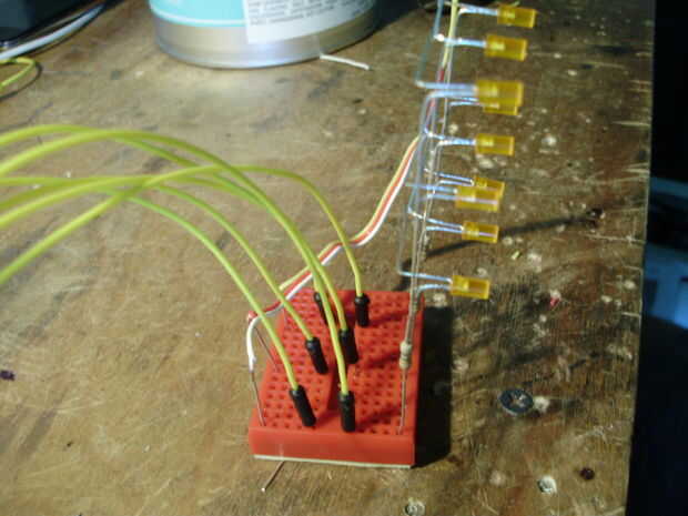 Para facilidad de construcción y desmontaje, enganchó la matriz hasta mi Arduino usando un protoboard mini y jumpers de la placa. Simplemente le enchufamos la matriz en la placa por las clavijas de tres ánodo. Para adjuntarlos a la placa, soldado sólido metal lleva a los extremos de los cables de cátodo. Utilicé los hilos que recortado de las resistencias.