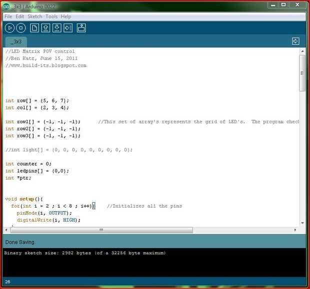 Ahora, no sé si hay un estándar para cómo pantallas LED ciclo a través de las filas o columnas, pero escribí mi programa control POV desde cero. Si vas hacia abajo a lo básico, funciona así:
