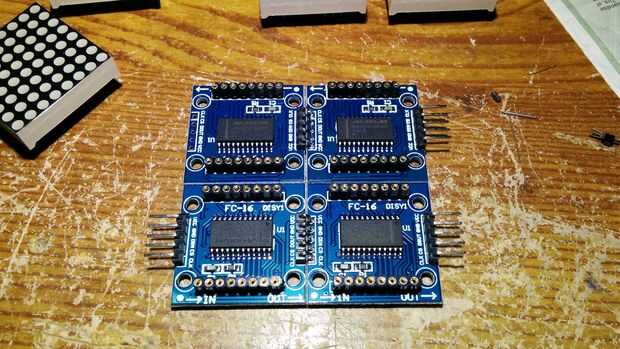 Esta parte es realmente bastante fácil. Solde los encabezados de la mujer en el PCB. Vamos a la cadena cuatro de estos módulos juntos, en dos pares. La soldadura de las cabeceras de pin de ángulo recto a la entrada de una tabla, pero no la salida de la soldadura aún.