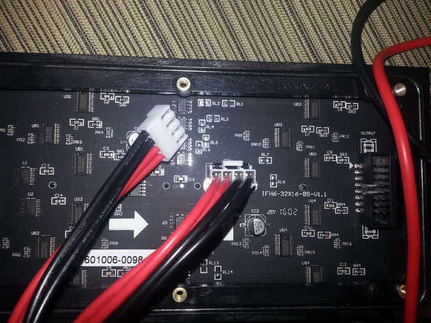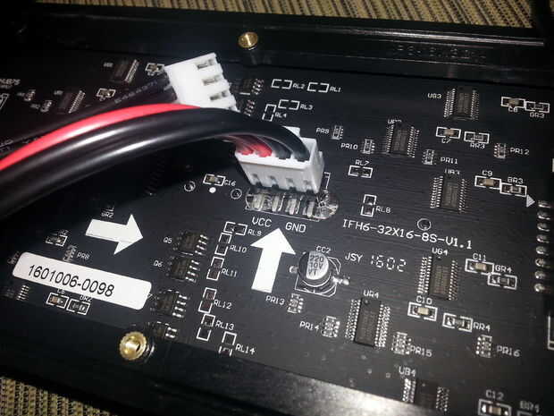 En este punto puede seguir adelante y conecte el cable de alimentación a la placa. Asegúrese de que usted siga la flecha y asegúrese de que conecta correctamente. Le da dos archivos adjuntos (en el caso tiene dos tableros) - sólo necesitas uno para enchufar. No enchufe el adaptador AC/DC hasta que esté totalmente listo para funcionar la placa de LED.