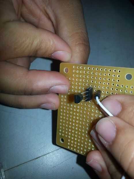 Para empezar, volver la mirada a su protoboard en cómo tienes todo conectado. Usted será esencialmente transferir este sobre a tu placa. (Un amigo mío me ayudó con esta parte no estaba muy seguro de cómo hacerlo, ella hizo muy simple como explicó). Se necesita uno de esos puertos a tu sensor de temperatura de la casa en caso de se queme la tira... pueden ser reemplazado fácilmente sin tener que totalmente resodder su proyecto. Para esto, pueden hacer el puerto hasta los dientes necesarios (tres para el sensor de temperatura). Seguir adelante y elegir el lugar para esto (ya que es donde empezamos). Desea que las clavijas de metal que sobresale en el lado con el cobre para este puerto.