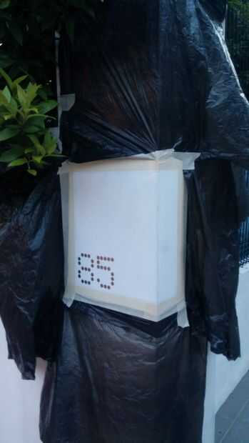 El resto de la zona fue enmascarado con cinta adhesiva simple y bolsas de basura, para crear un efecto envolvente esquina placa. Parece más 3D de esta manera, en lugar de sólo una plaza plana pintada en una pared.