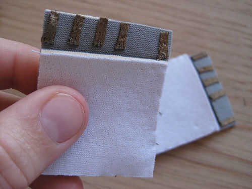 El interior se parece a los sensores de presión de la tela, excepto cada punto está conectado a una pestaña separada tela conductora. La desventaja es que conexiones a estas fichas y etiquetas separadas ocupan mucho espacio, especialmente si usted quiere conseguir una apretado matriz de sensores. Una red de líneas y columnas y algo de código para analizar estos (por separado de la energía y medir) permitiría mucho más espacio. Esta versión es agradable porque es tan simple.