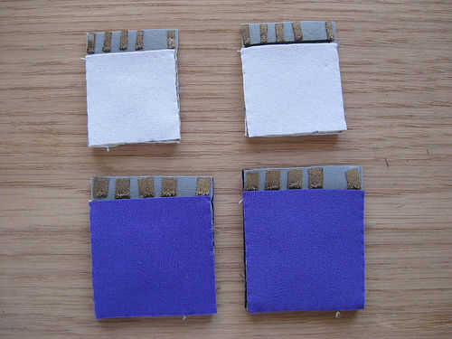 Este Instructable cubre dos versiones ligeramente diferentes de la matriz del sensor de presión. La única diferencia es la distancia entre los sensores de presión individual en la matriz. En uno de ellos se colocan prácticamente al lado de cada uno (blanco) y en la otra hay un espacio de 1 cm entre cada sensor (púrpura), sino por el grosor del neopreno no es posible presionar entre los sensores sin presionar un sensor. Espero que esto tiene sentido.