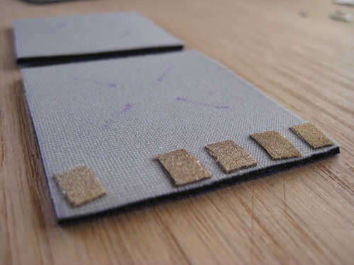 costura hilo conductor en neopreno para crear una almohadilla sensible de la presión. Este sensor es muy similar a la tela doble Sensor o vis versa. Y también cerca del Sensor de presión de la tela, pero la diferencia es que se minimiza la superficie