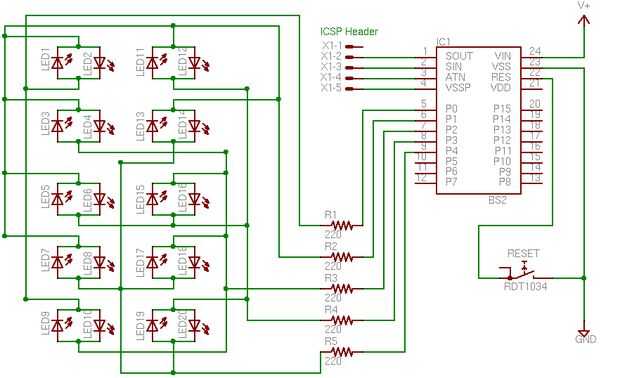 Este esquema se pone junto con el diseño mecánico en mente. Podrás ver la retícula de LEDs en la izquierda, esta es la orientación que se ha escrito el código de BS2. Tenga en cuenta que cada par de LEDs tienen el ánodo conectado al cátodo del otro. Luego se conectan a uno de los cinco pines de entrada-salida.
