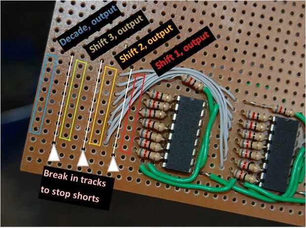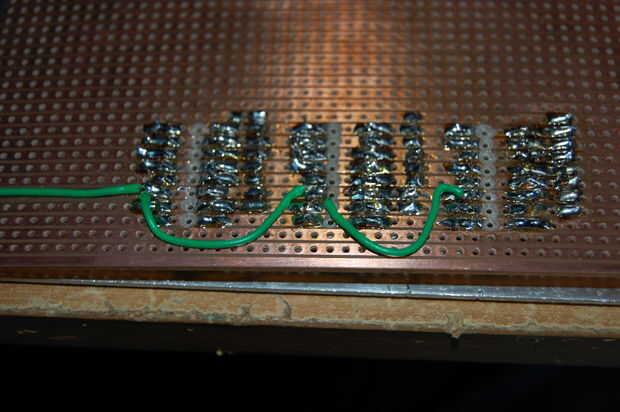 9. Con una broca pequeña hacer 3 líneas verticales de roturas en las pistas de cobre 8, esto es separar cada salida. Tienen que ser separados por lo menos dos agujeros.