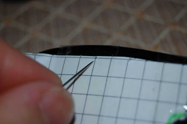 10. Cuando esté seguro de todo está alineado, agarrar una aguja de coser y presione la punta en cada cruce de la red, creando un pequeño agujero en la superficie de los cristales en cada punto. (Imagen 8 y 9)