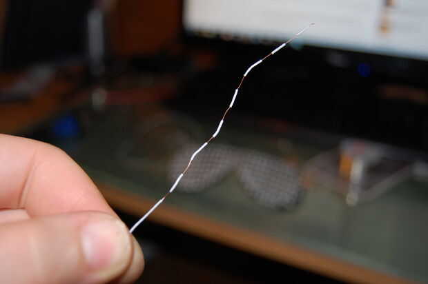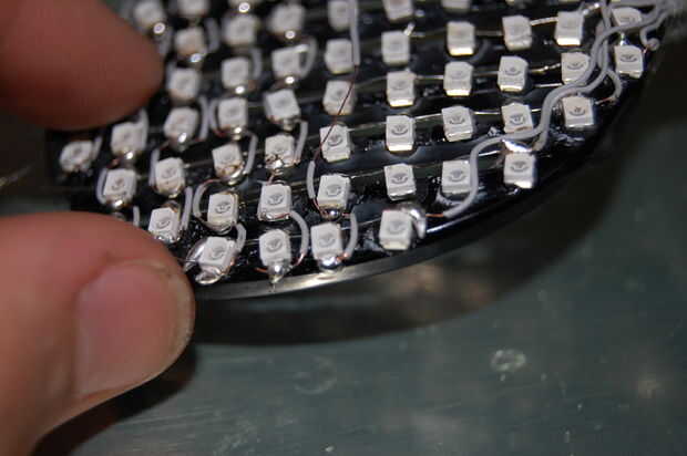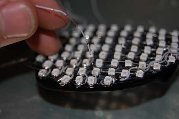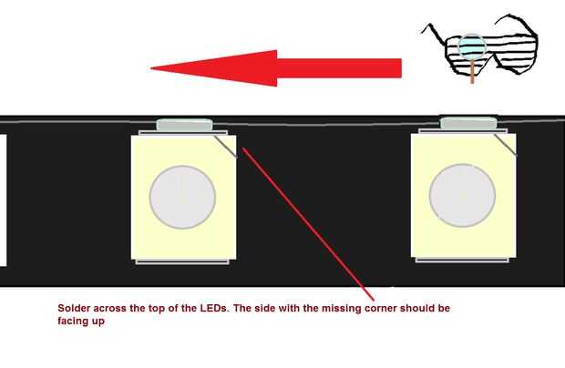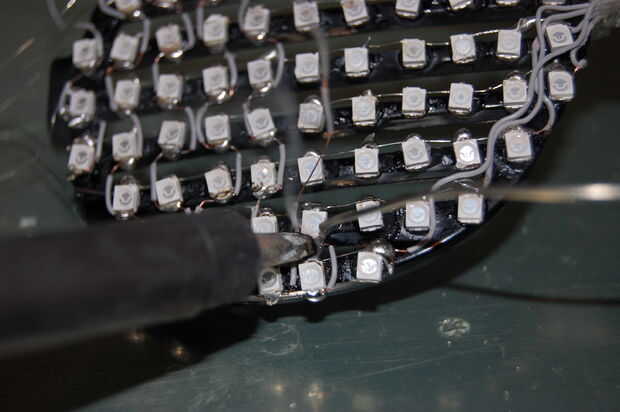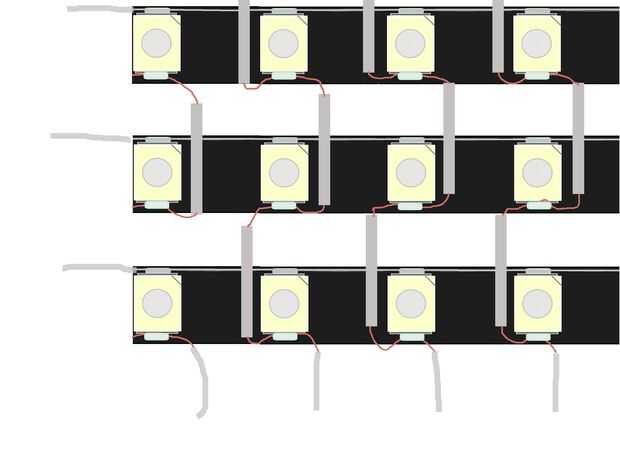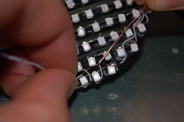 - A partir de la fila superior con el LED más lejano a la derecha como se miran tomar un filamento individual del alambre y soldar al cátodo (empotrada en la esquina).