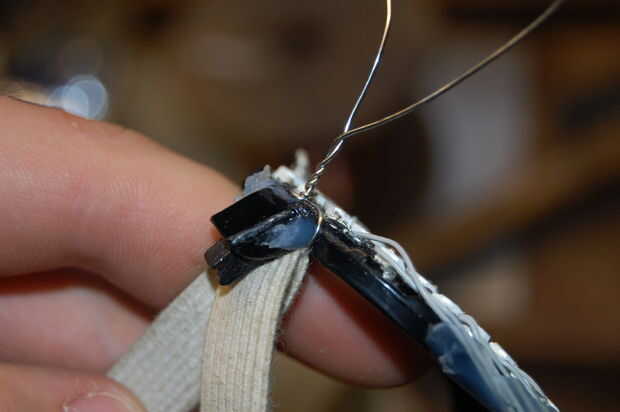 4. Poner un alambre alrededor del elástico y luego en el medio del listón.
