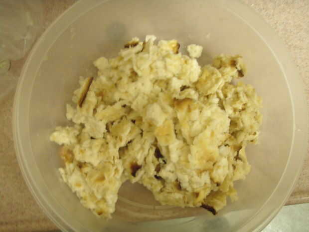 Traer el contenedor vacío al lado de la taza de la matzá-Spa. Tomar puñados de la mezcla suavizante de matzá y escurra el agua antes de colocarlo en el recipiente vacío.
