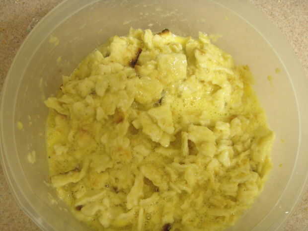 Agregue el huevo a la matzá empapado y revuelva. Deje reposar durante 5-10 minutos dependiendo del tamaño de los trozos de matzá, hasta que los trozos ablanden considerablemente más.