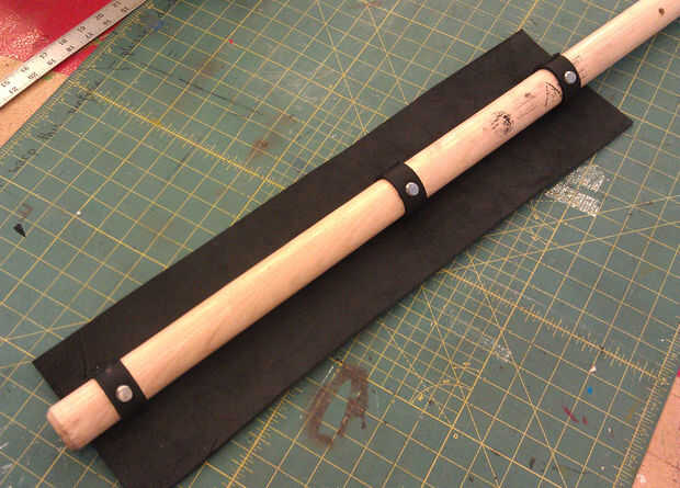 Las debajo-correas fueron espaciadas para que tenías dos opciones para la celebración del maul. Medir el abrigo de cuero por lo que hay una superposición de 1/4" y luego sumergirlo durante 30 minutos. Comenzar con pegamento para mantener el cuero. Si se trabaja con un pequeño trozo, pegamento funcionará para todo, pero en este caso utilicé Sobo (oído pasta de trigo es muy bueno) para el resto del mango desde el atar apagado un rato. Envuelva el todo
