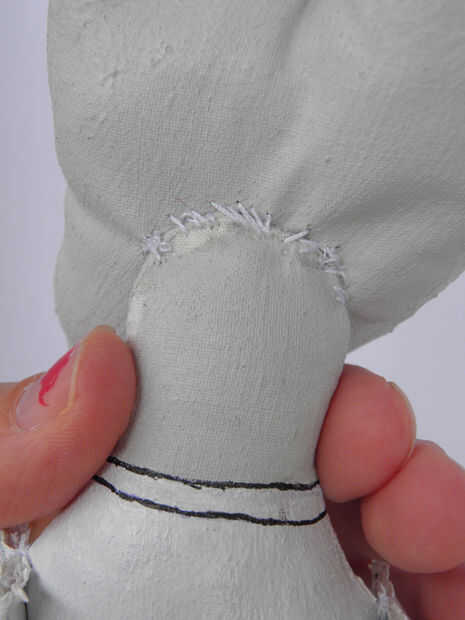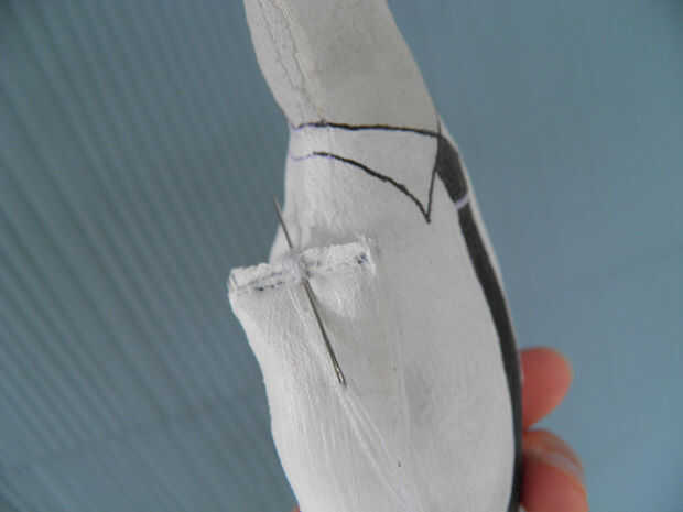 Vuelva a enhebrar la aguja y coser la pieza de cabeza en el cuello y la pieza de cola en la parte posterior.