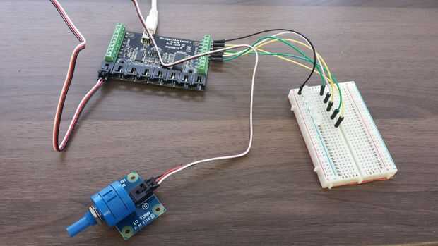 Conectar el Sensor de rotación a 0 entrada analógica usando el cable del sensor. Conectar los LEDs a salidas digitales 0 a 4, como se muestra en la imagen. El cátodo (cable corto) está conectado a la tierra y el ánodo (alambre más largo) está conectado a la salida digital.