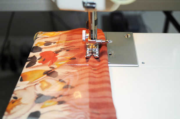 En la parte superior de su tejido, más doblar 2 pulgadas y en su lugar para crear un dobladillo para su elástica ir a través. Coser a lo largo de su línea fijado con ya sea una máquina o a mano.