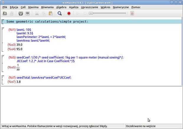 La primera célula contiene cálculos y dimensiones básicas. La segunda célula contiene coeficientes de seguridad y semilla ('seedCoef' y 'JICCoef'). El primero de ellos está parado para el área de la tierra por un kg de la semilla de hierba (1kg por 30m ^ 2 - creo que el Maxima tiene unidades construidas en - debería ser una actualización de este instructable). El segundo representa incertidumbre en la operación - en el caso de lugares en el jardín deberían ser muy (que fue el caso con el jardín real, aunque la semilla de la hierba sobrante fue comprado por error...). La tercera celda contiene resultado deseado: la cantidad de las semillas de césped para plantar el césped.